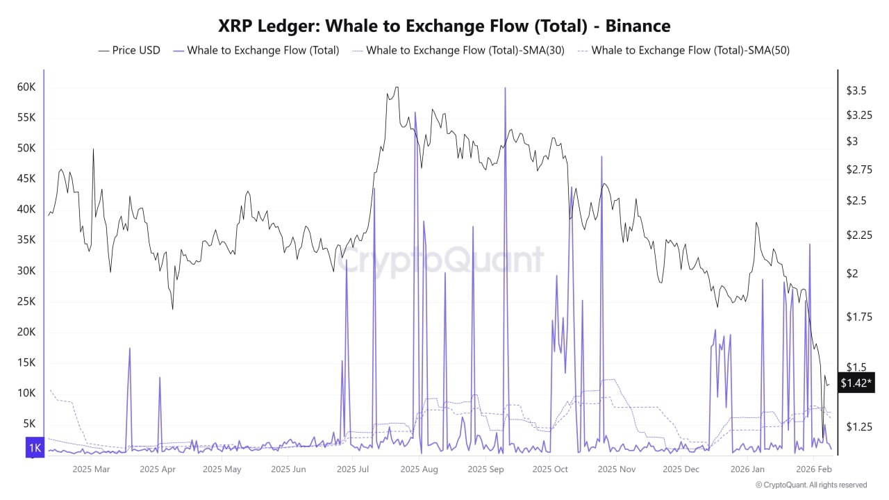 Se c'è un ulteriore scarico da fonti macroeconomiche o BTC, il prezzo potrebbe scendere un po' di più. Tuttavia, non ci si aspetta che questo calo sia supportato dalla vendita di balene. Monitorare il grafico di Binance è fondamentale per questa metrica perché liquidità, profondità e concentrazione istituzionale sono tutte evidenti su questo scambio. Binance ha il volume più alto di spot e derivati e il libro ordini più profondo per XRP, rendendolo un'area di trading primaria per balene e istituzioni. In altre parole, mentre altri scambi vengono utilizzati per trasferimenti, a volte solo movimenti di portafoglio, il denaro che realmente guida il prezzo è su Binance. Su altri scambi, la liquidità è bassa, rendendo difficile discernere chiaramente l'intento di vendita. Tuttavia, su Binance, se una balena sta inviando XRP a Binance, significa che sta considerando di vendere. In breve, la metrica del flusso di scambio delle balene di Binance misura l'azione, non l'aspettativa. Il grafico di Binance funge da indicatore anticipato, catturando il comportamento prima dell'azione del prezzo. $XRP