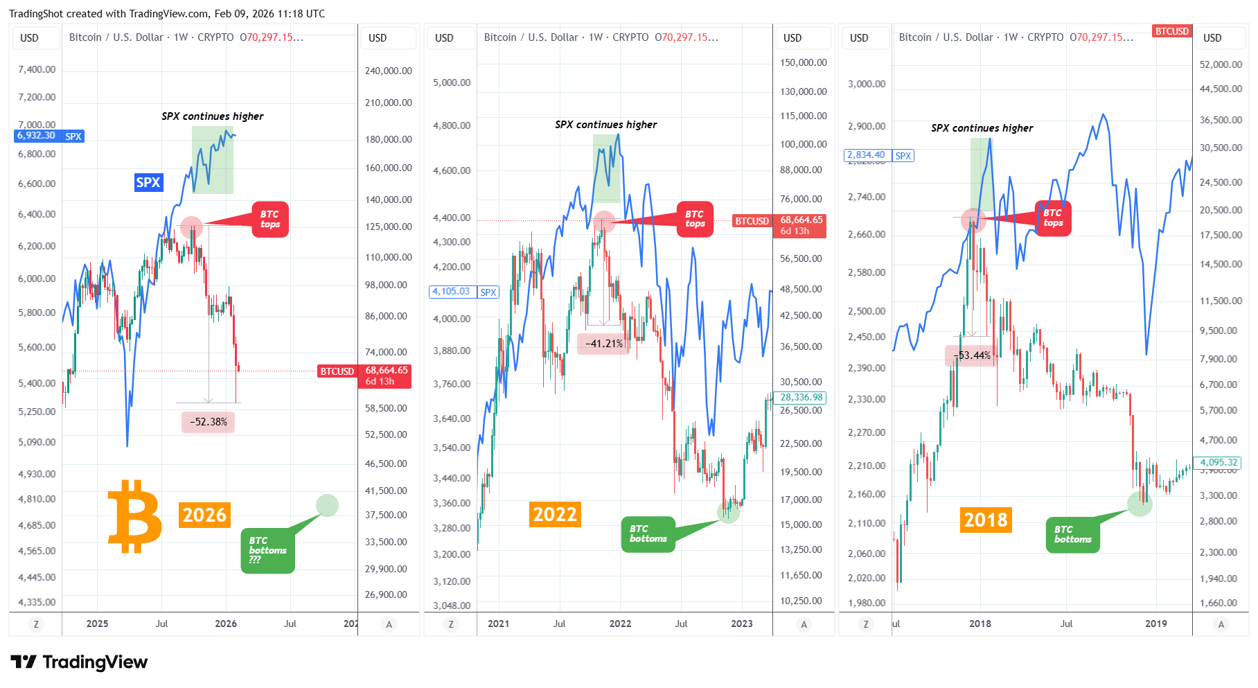 Bitcoin (BTCUSD) ha completato un calo di oltre -50% la scorsa settimana rispetto al suo massimo storico (ATH) di ottobre 2025, mentre le azioni sono rimaste vicine al loro ATH. Questo grafico mostra che mentre BTC è ovviamente in un ciclo ribassista, l'S&P500 (SPX) illustrato dalla linea di tendenza blu, è ancora nel territorio del ciclo rialzista.