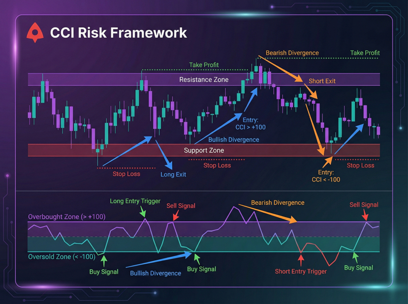 Profit targets are equally critical in managing exposure. As a momentum oscillator, the CCI signals trend exhaustion during extreme readings. Traders can scale out portions of their positions near key CCI levels such as zero-line crosses or when price reaches previous resistance zones. Using partial profit-taking allows locking in gains while giving the remainder room to run.