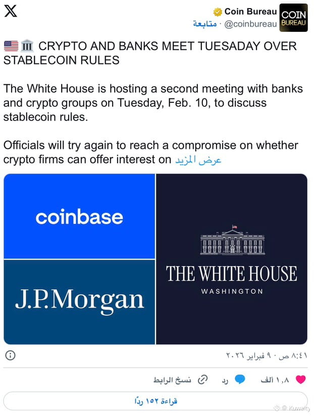 سيستضيف البيت الأبيض اجتماعًا مهمًا آخر يوم الثلاثاء 10 فبراير 2026، يجمع بنوكًا كبرى وشركات كريبتو. الهدف واضح، إذ يسعى المسؤولون إلى تسوية الخلافات حول قواعد العملات المستقرة ودفع تشريعات الكريبتو المتعثرة إلى الأمام.