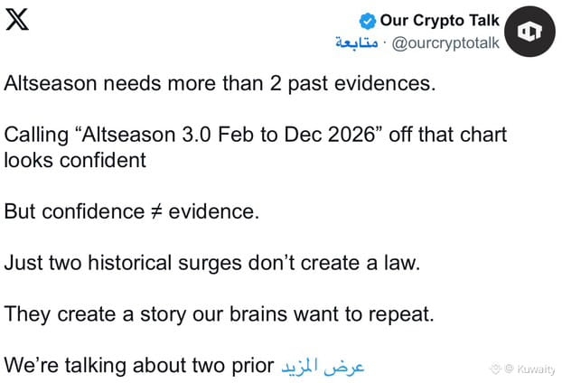 فكرة «موسم العملات البديلة 3.0» تبدو مقنعة. الرسوم البيانية نظيفة. والتسلسل الزمني مألوف. لكن الثقة لا تعني الدليل. وكما أشار حساب Our Crypto Talk، فإن بناء توقع لموسم العملات البديلة في 2026 على موجتين تاريخيتين فقط ضعيف إحصائياً. حدثان يصنعان سردية. ولا يصنعان قانوناً. تاريخ العملات المشفرة قصير. والتحولات الهيكلية مستمرة. وافتراض التكرار البسيط غالباً ما يفشل.