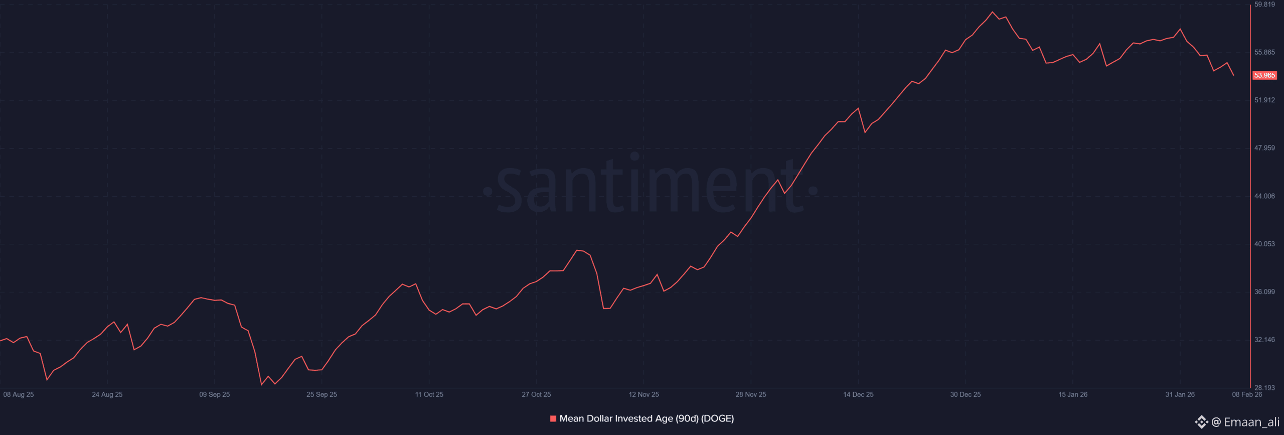 Even more importantly, the "Mean Dollar Invested Age" for Dogecoin sits at 53. This suggests that the coins are not being moved around aggressively and that long-term holders are staying put as new capital flows into the network. This behavior shows that investors have conviction and are not panicking because of recent market crashes. When holders refuse to sell at lower prices, the pressure for the price to drop further usually weakens.