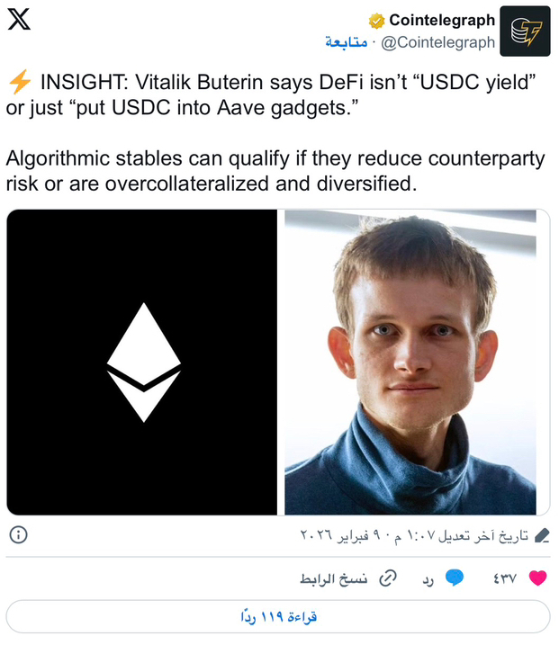 • يقول فيتاليك بوتيرين إن العائد القائم على عملة USDC يغفل جوهر التمويل اللامركزي الحقيقي.