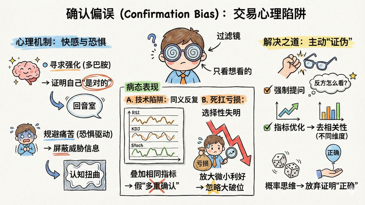 Il nucleo di questo bias risiede nella gestione asimmetrica delle informazioni: i trader tendono a osservare il mercato attraverso un “filtro” - catturando automaticamente e amplificando le informazioni che supportano le proprie posizioni, mentre inconsapevolmente schermano, distorcono o sminuiscono i segnali di avvertimento che contraddicono le proprie opinioni.