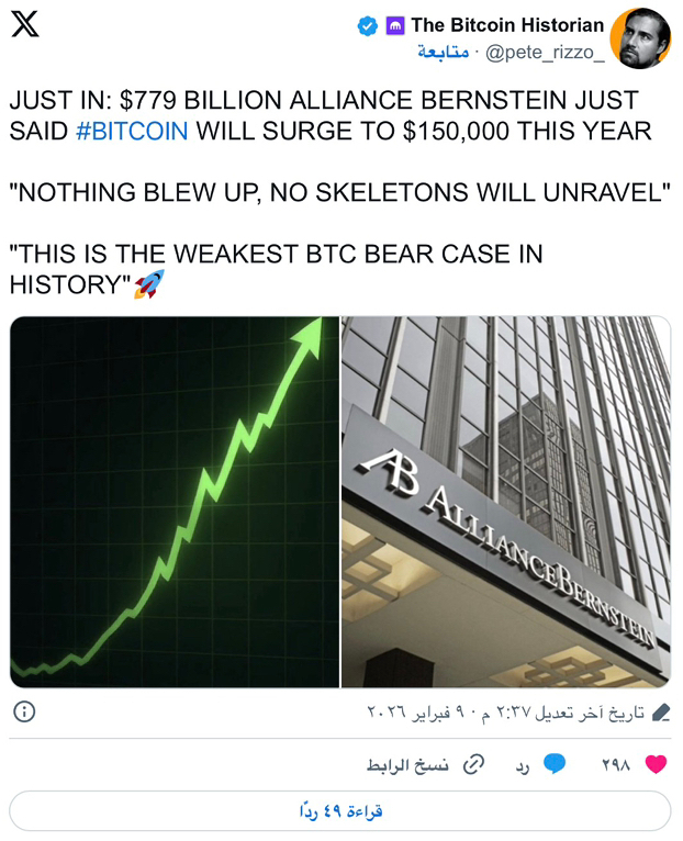 • تتوقع شركة أليانس بيرنشتاين أن يصل سعر البيتكوين إلى 150 ألف دولار مع تلاشي المخاطر الهيكلية