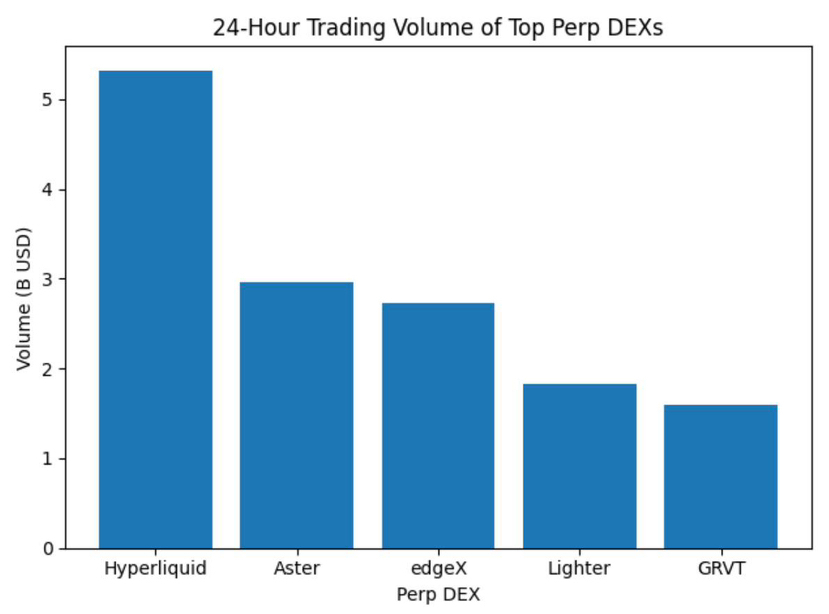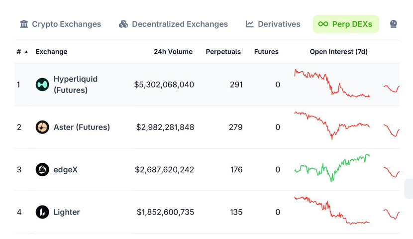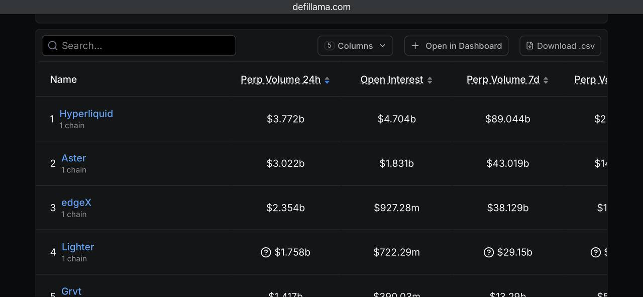 Quell'importo è ancora inferiore a decine di miliardi che vengono scambiati quotidianamente sui CEX, ma è comunque sostanziale. Hyperliquid è un protocollo basato su Ethereum, che è al top con circa $5,3 miliardi e un interesse aperto di $4,7 miliardi. Aster, che supporta diverse catene, si colloca al secondo posto con un volume di $3 miliardi e un interesse aperto di 1,8 miliardi. GRVT, Lighter e edgeX sono altre piattaforme che stanno espandendosi rapidamente.