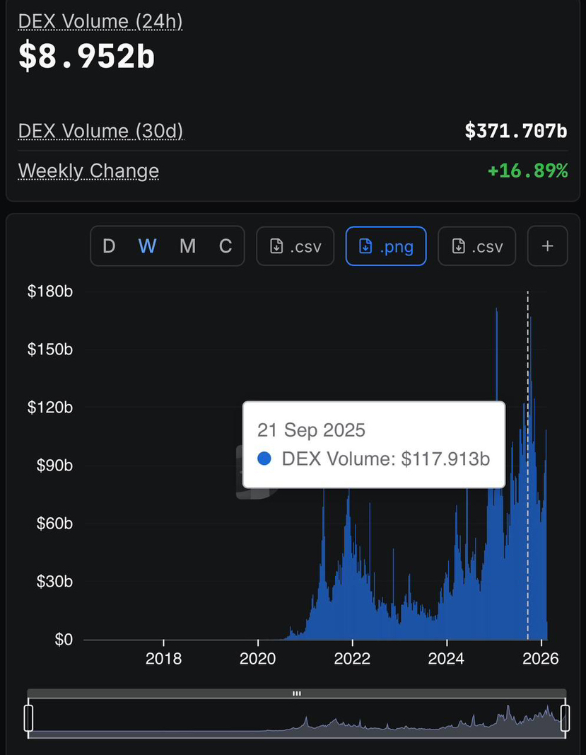 Il cross-margin è attualmente supportato da molti DEX, consentendo agli utenti di collaterizzare un certo numero di posizioni. Accettano anche altre forme di garanzia come i token di liquid-staking, che ricevono rendimenti di staking anche quando vengono utilizzati come margine. Tali innovazioni sono utilizzate per rendere i DEX competitivi rispetto ai CEX in termini di efficienza del capitale. È rappresentato nel grafico a linee qui sotto che il volume di trading DEX è aumentato da inizio 2025 a inizio 2026.