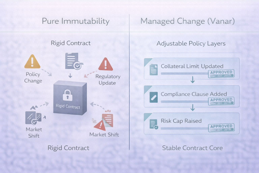 L'angolo distintivo non assomiglia alla retorica della catena veloce di tipo standard quando guardo a Vanar. Vanar considera una blockchain come un sistema che può essere cambiato in modo sicuro e non comprometterà la fiducia. Questo è ciò di cui la finanza ha bisogno: non codice impeccabile, ma una politica aggiornabile con un record testabile.