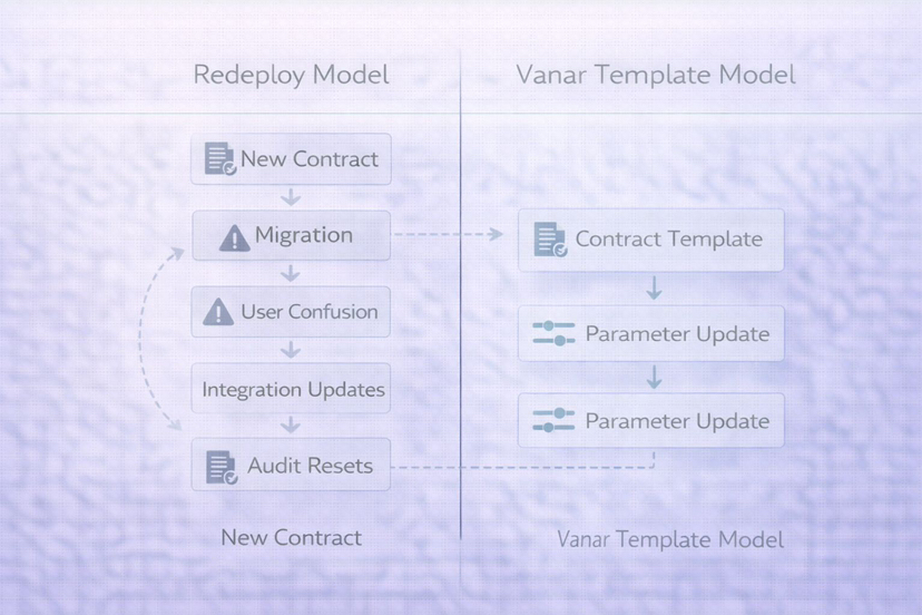 La cosa più importante riguardo a questo per RWA: le regole associate agli attivi del mondo reale non cessano mai di muoversi. La tokenizzazione RWA sembra facile fino a quando non si enumerano le alterazioni che avvengono nella pratica: un prestatore regola le normative sulle garanzie quando la volatilità aumenta; una giurisdizione modifica ciò che qualifica come accreditato; un dipartimento di conformità introduce una disposizione quando si svolge un audit; un prodotto si espande a una nuova area e richiede nuovi limiti. In un mondo ordinario dove i contratti sono immutabili, ciascuno di questi forma un fork complesso. Ti trovi di fronte all'opzione di ridistribuire e ridistribuire o di creare un sistema di aggiornamento casuale che spaventa gli utenti. Un terreno di mezzo meno corrotto è fornito da Vanar nella sua strategia di template + parametri. Considera i cambiamenti come previsti, limitati e verificabili. Il contratto non è una roccia che non si muove; è una macchina i cui indicatori possono essere regolati e tutti sono consapevoli di quali indicatori sono disponibili.