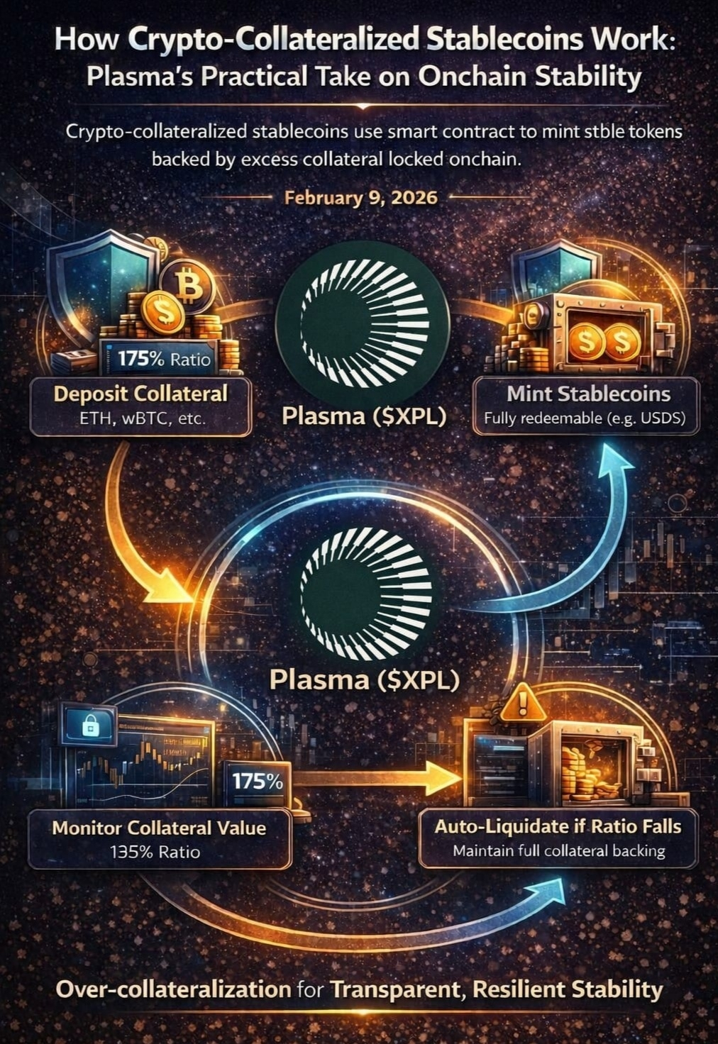 Today, February 9, 2026, I want to slow things down and explain a topic that keeps coming up in conversations with traders, builders, and long-term investors alike. I’m Dr_MD_07, and today I’m writing about how crypto-collateralized stablecoins actually work, using Plasma as a practical reference point rather than theory. Stablecoins are often treated as background infrastructure, but in the current market cycle, how stability is engineered matters more than ever.