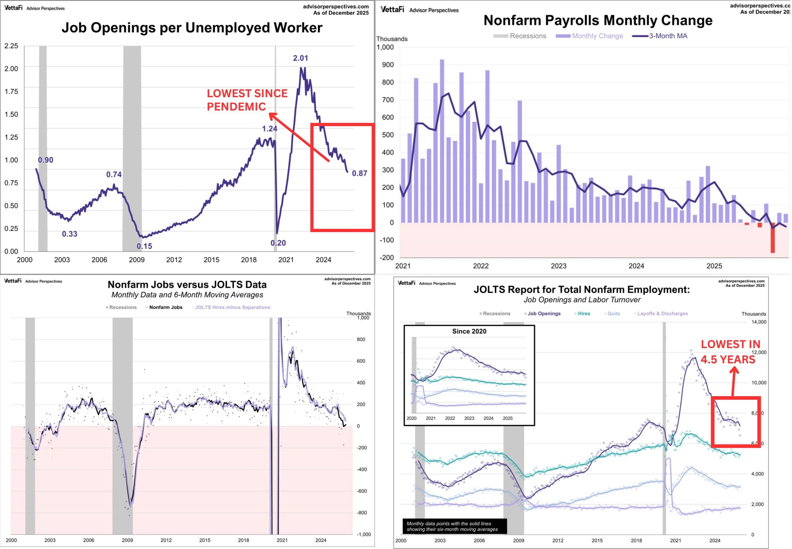 JOLTS data shows hiring rates are flat. Quit rates are stuck near 2.0%, meaning workers are not confident enough to leave jobs voluntarily. When quits fall while openings fall, it shows workers are defensive and firms are cautious.