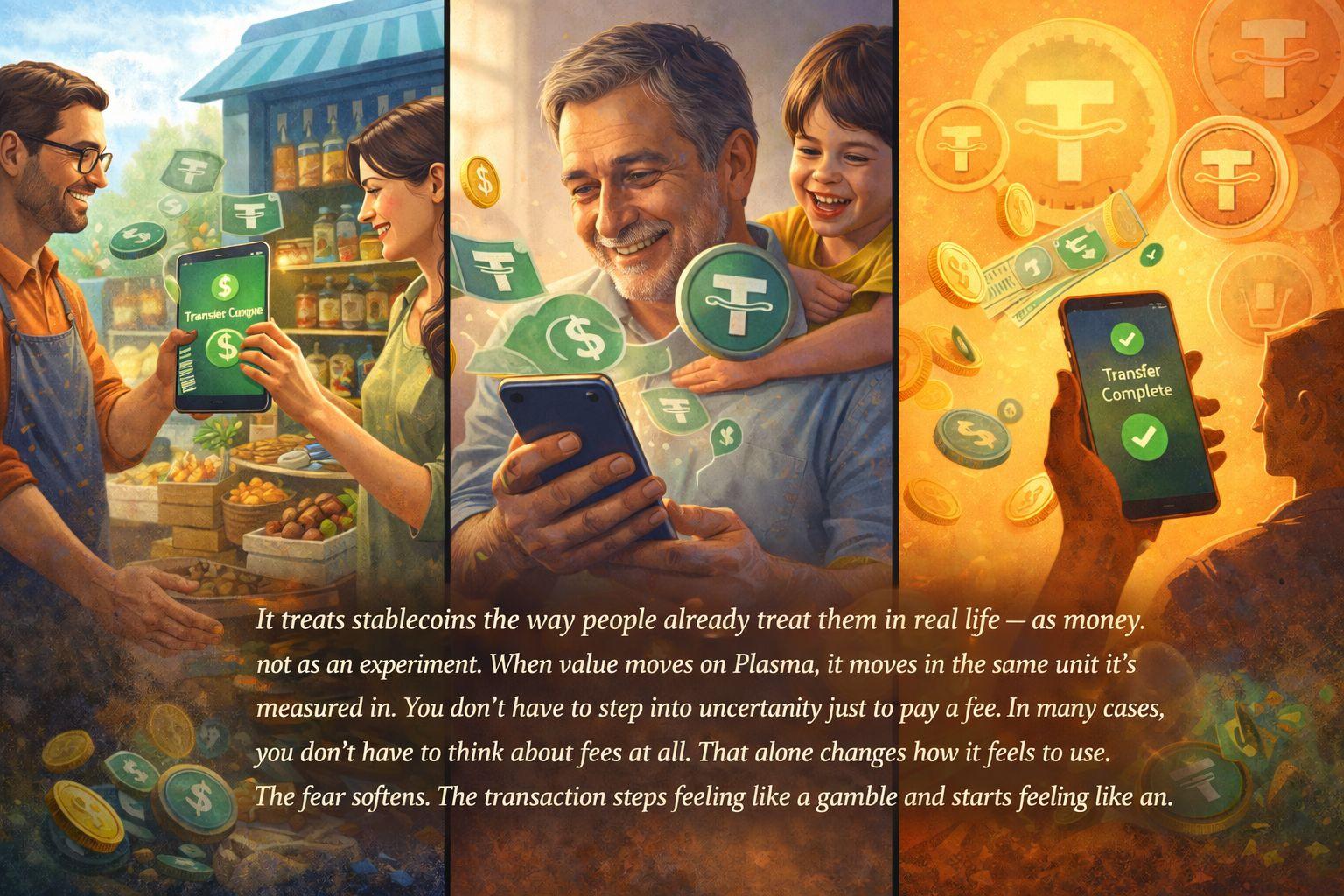It treats stablecoins the way people already treat them in real life — as money, not as an experiment. When value moves on Plasma, it moves in the same unit it’s measured in. You don’t have to step into uncertainty just to pay a fee. In many cases, you don’t have to think about fees at all. That alone changes how it feels to use. The fear softens. The transaction stops feeling like a gamble and starts feeling like an action.
