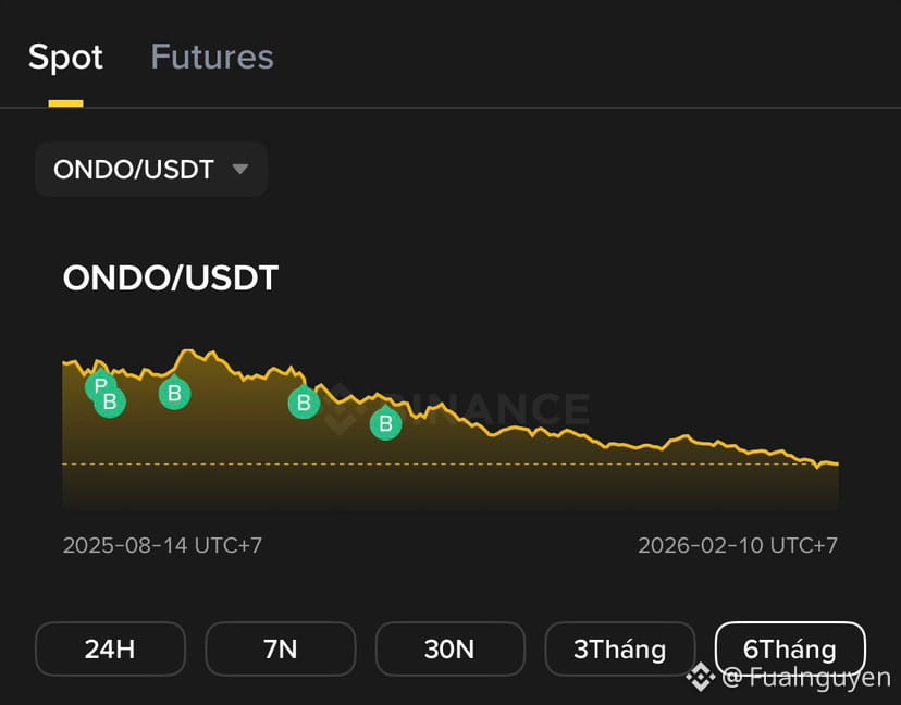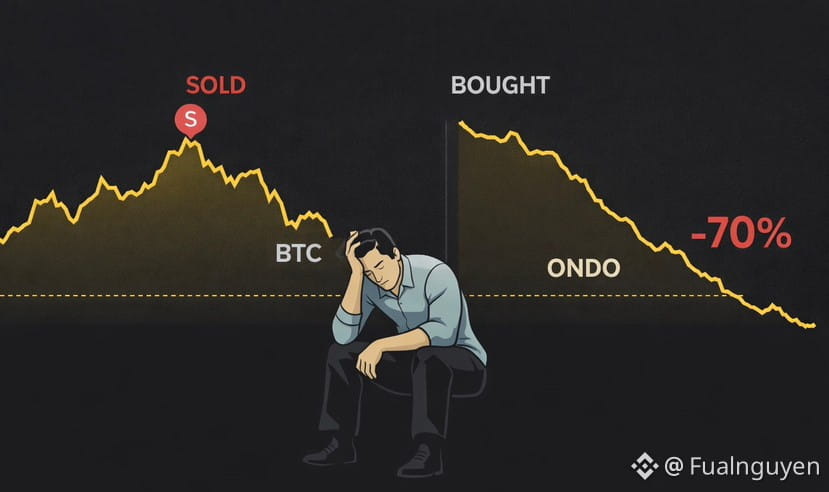 Sai lầm không nằm ở đó. Sai lầm nằm ở nhịp kế tiếp. Logic đúng, nhưng thị trường không đi theo logic. Tôi cuộn vốn sang ONDO với một giả định tưởng như rất hợp lý: Dòng tiền sau khi rời khỏi các coin nền tảng lớn sẽ dịch chuyển sang các altcoin topcap, đặc biệt là những dự án có narrative dài hạn, liên quan đến tài sản thực và dòng tiền tổ chức. ONDO hội đủ mọi điều kiện trên giấy: