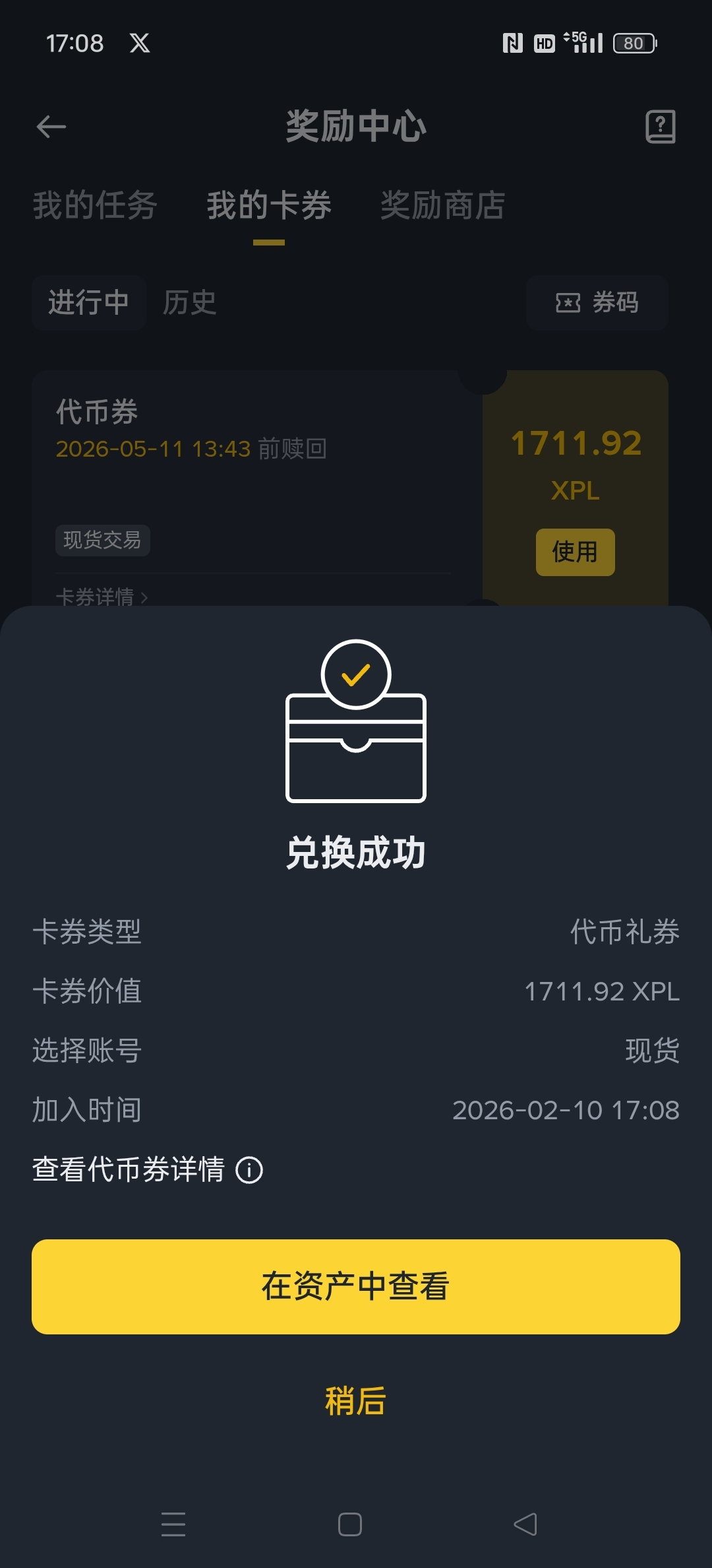 就在刚才,Plasma的1月29日快照奖励终于砸到了我的账户——整整1711.92枚XPL代币券,一键兑换到现货账户的瞬间,所有熬夜写稿的疲惫都烟消云散了。