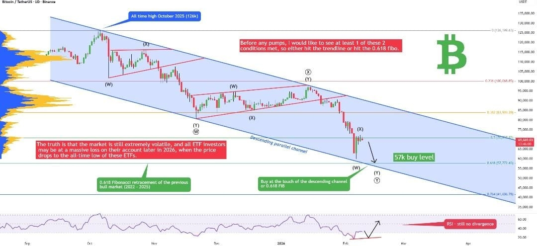 First, Bitcoin hasn’t yet reached the 0.618 Fibonacci retracement of the previous bull cycle (2022–2025). That level sits around $57,772, and historically, price tends to gravitate toward this zone during deeper corrections. Right now, it looks like a clear magnet.