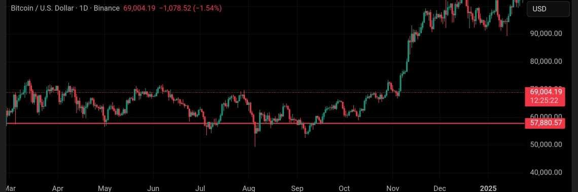 • $58,000: Near the 200-week moving average, a historically critical long-term support.