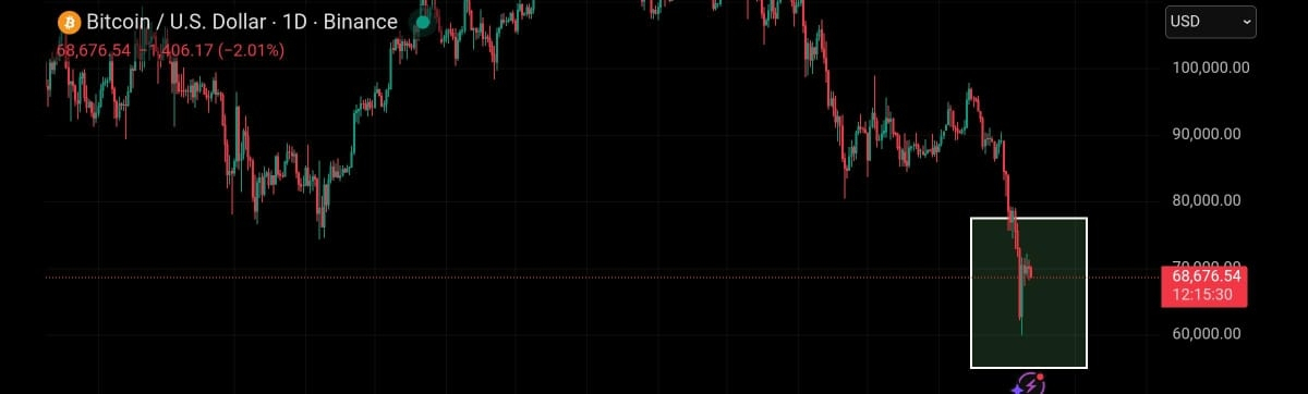 That dip marked Bitcoin’s lowest level since October 2024 and put it roughly 52% below the $126,000 peak. By Monday, price looked almost calm again, hovering near $70,700. Classic Bitcoin behavior, violent moves followed by eerie quiet.