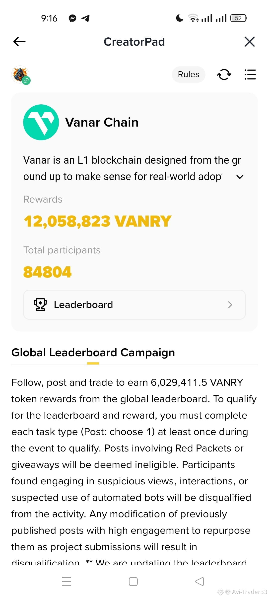 The race for the global VANRY leaderboard is officially on, and the opportunity is massive. A total of 6,029,411.5 VANRY tokens are up for grabs for participants who actively follow, post, and trade during the event period. What makes this competition exciting is that it rewards real engagement, not shortcuts. To qualify, every participant must complete each activity type at least once, with the Post category requiring one approved post that follows the event guidelines.