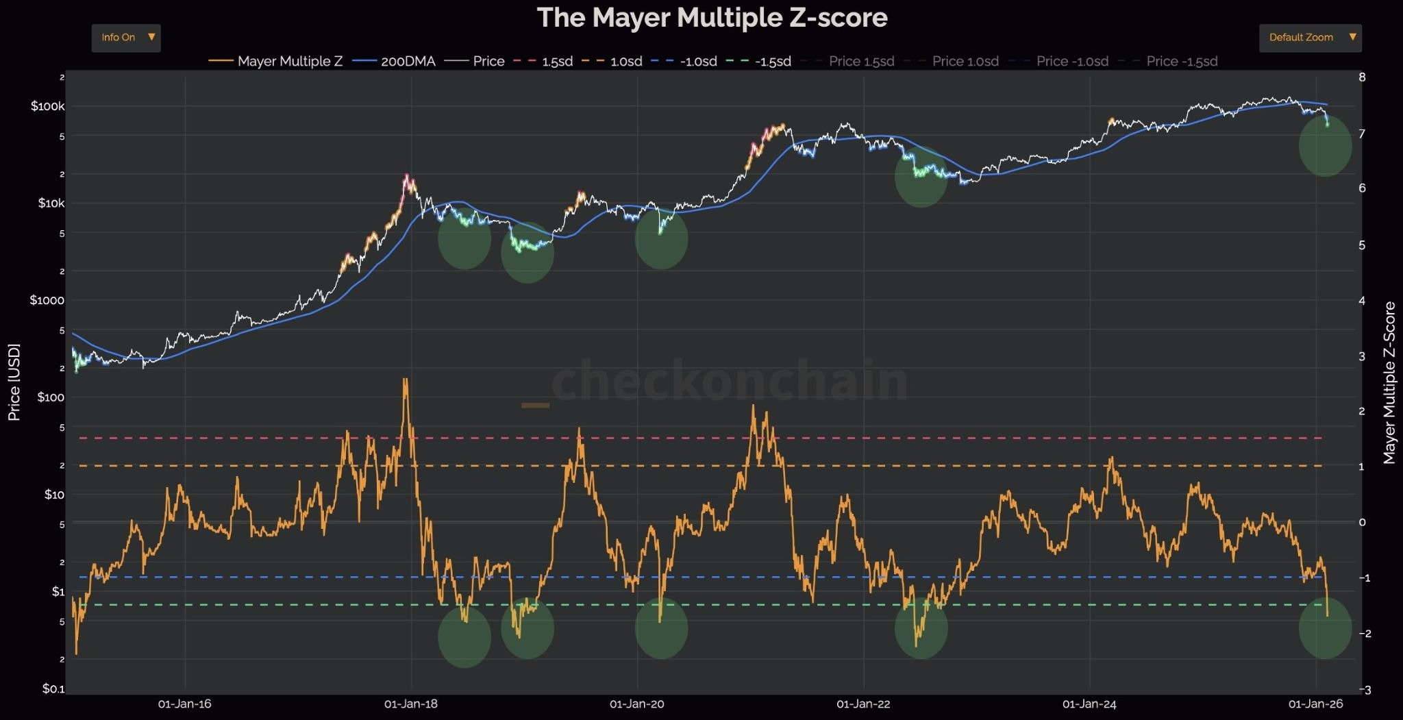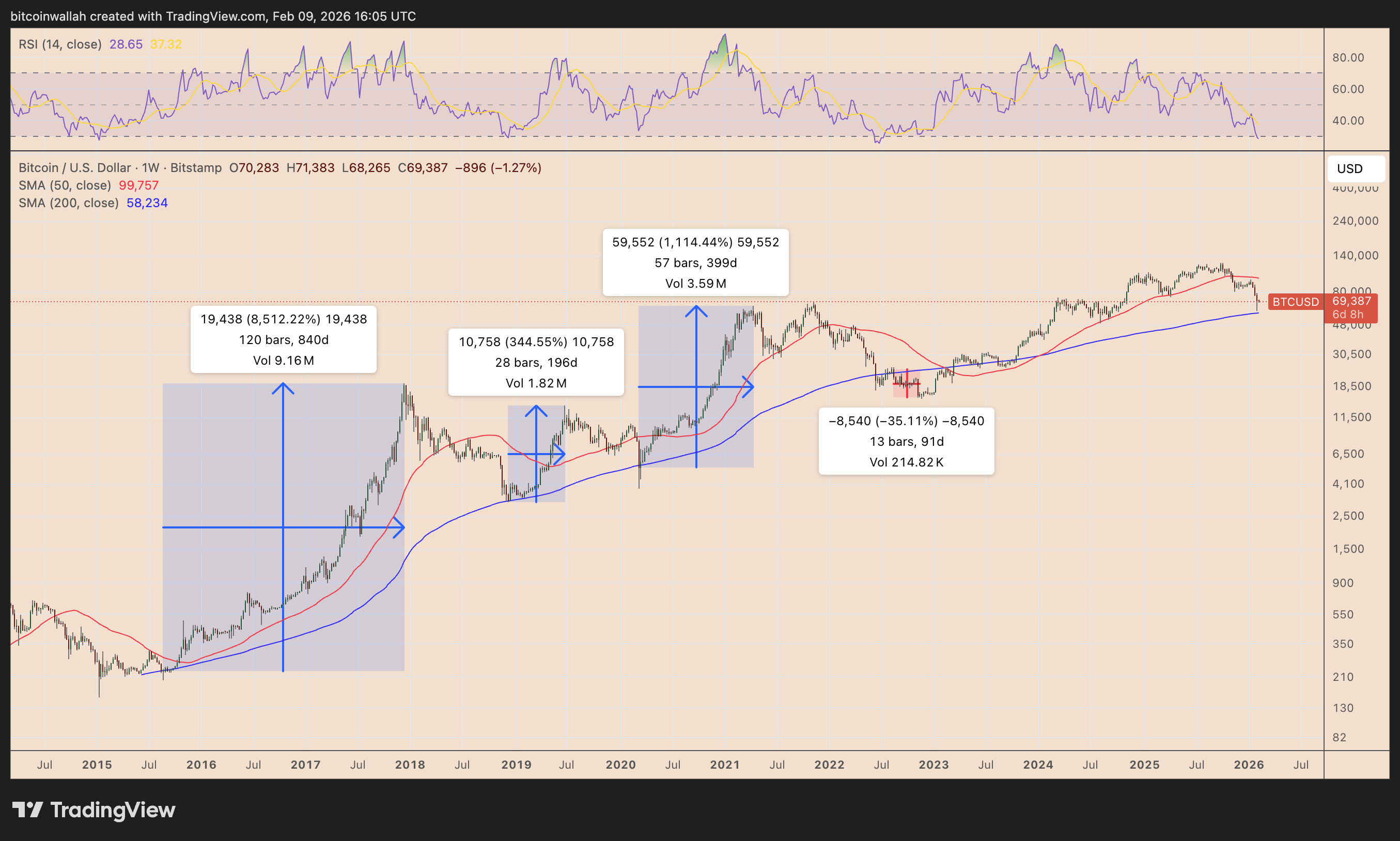 Comportamiento del BTC vs SMA200 y RSI
