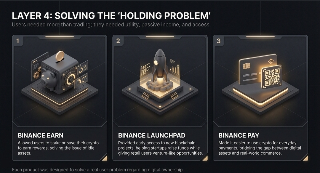 Nel tempo, Binance si è resa conto che gli utenti di criptovalute avevano bisogno di più di un semplice posto dove scambiare. Le persone volevano modi per guadagnare reddito passivo, sostenere nuovi progetti, effettuare pagamenti ed esplorare la proprietà digitale. In risposta, Binance ha iniziato ad espandere i suoi servizi.
