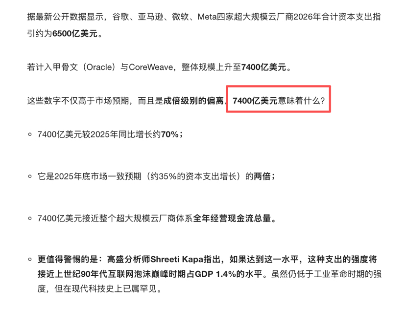 - 现在呢?单单AI这个赛道,一年的资本开支预测就奔着5万亿去了——规模已经超过当年四万亿的水平,而且这还是民营科技公司+部分政府引导资金的自发行为,不是国家层面的“救市包”。