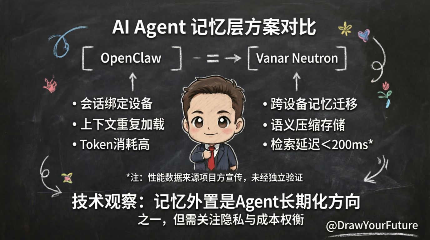 这点,在varnar开发的Neutron系统中得到了很好的解决。Varnar可以为Agent提供一个永久记忆的内存API。而且这样做有很大的好处,Agent不用局限于单个机器,在不同机器和环境中可以更方便的迁移,这一变革相当于当年给计算机配了一块巨大的高速存储硬盘,这太棒了,不用怕数据丢失,你之前的成功可以在Vanar里很好的保存,可以继续使用,继续进行你之前的工作,让你避免重复花token。