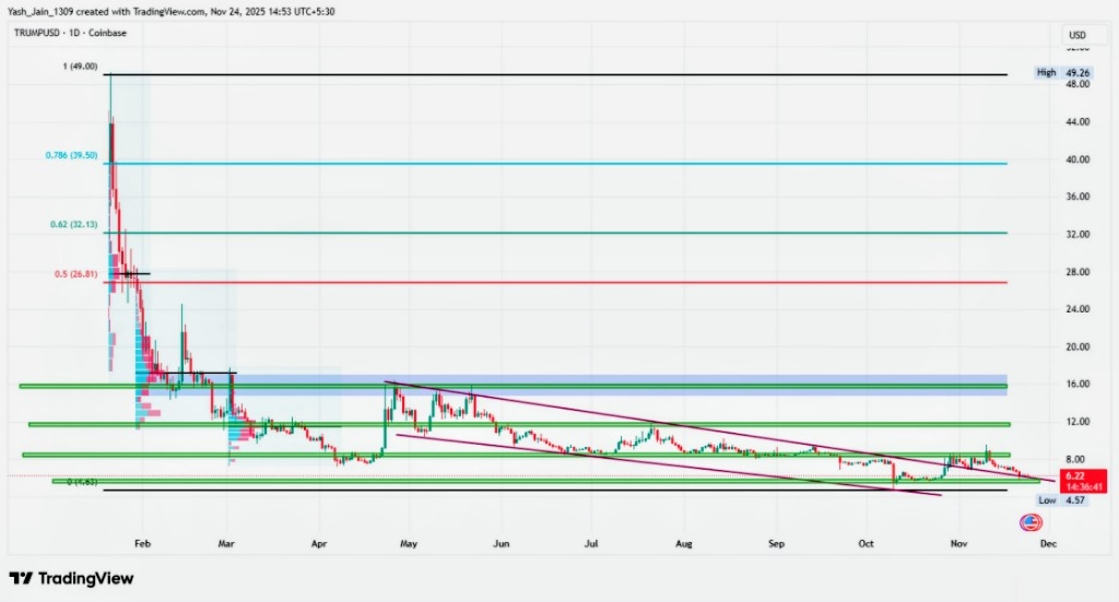 TRUMP exploded post-launch: Started at ~$6.50, hit $73+ in days on inauguration buzz, market cap topped $7B. Then crashed to $1.21 by mid-2025 amid market cools. In 2026 so far, it's hovered $3-5, down 80% yearly from peak but resilient for a meme. Key: Deflationary burns and community charity (vets) help scarcity, but politics drive 99% swings!