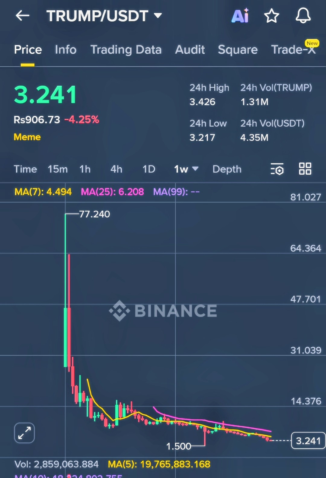As of February 11, 2026 (11:17 AM PKT), TRUMP's at about $3.15-3.24 USD, down 4-5% in the last 24 hours with $60-70M trading volume. Your screenshot shows $3.241, matching the dip – it's volatile, influenced by political news, tariffs, and meme trends. Currently, it's 95% below its ATH of $73-75 in Jan 2025, but up 160% from its low of $1.21 later that year. Market cap's ~$730-760M, ranking #65-79. Short-term: Bearish with MA(7) at $4.49 and falling trends, but could bounce if Trump policies boost crypto sentiment. Risks? High volatility – it's a meme, so hype fades fast!