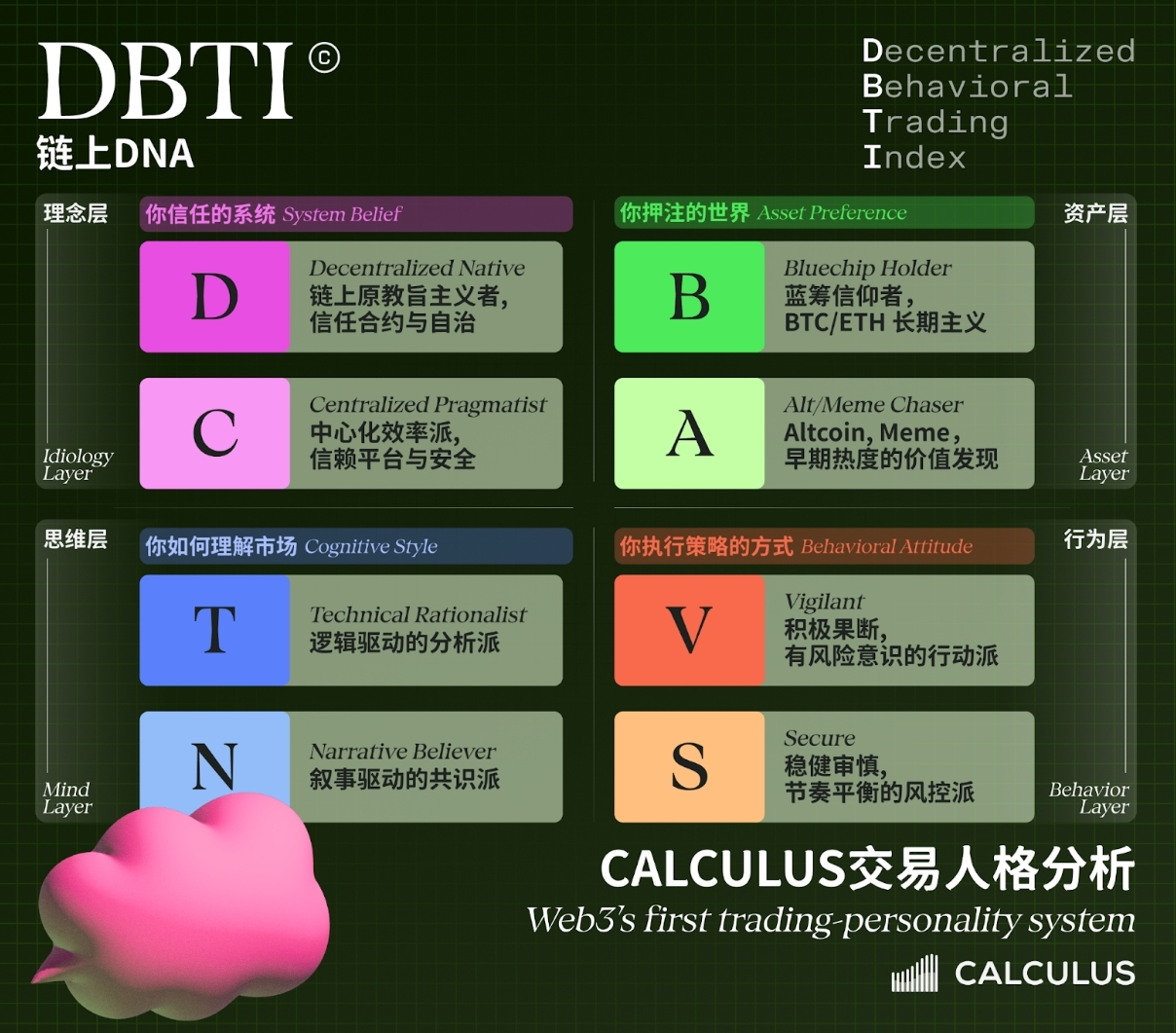 Diversamente dai test psicologici tradizionali, il DBTI (sistema di personalità per il trading decentralizzato) promosso da Calculus Finance (https://x.com/CalculusFinance) utilizza un modello di data mining non invasivo: