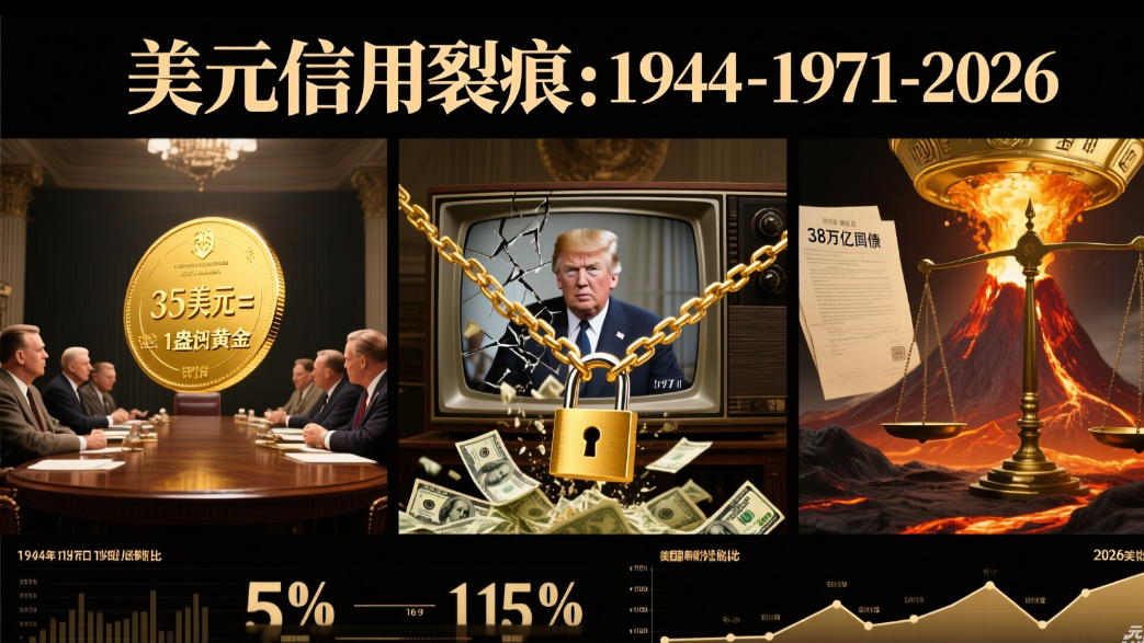Ripercorrendo la storia, il sistema di Bretton Woods legava il dollaro a 35 dollari per oncia d'oro, nel 1971 il dollaro si è scollegato dall'oro, dando inizio a una stampa di moneta sfrenata. La crisi della bolla patrimoniale ha fatto scendere la quota dell'industria manifatturiera americana dal 51% al 15%. Nel 2026 la situazione si ribalta, sotto l'impatto delle tariffe di Trump, il capitale globale abbandona i titoli di stato americani per comprare oro. Il debito pubblico americano supera i 38 trilioni di dollari, gli interessi superano i 1 trilione di dollari, e il credito del dollaro mostra crepe.