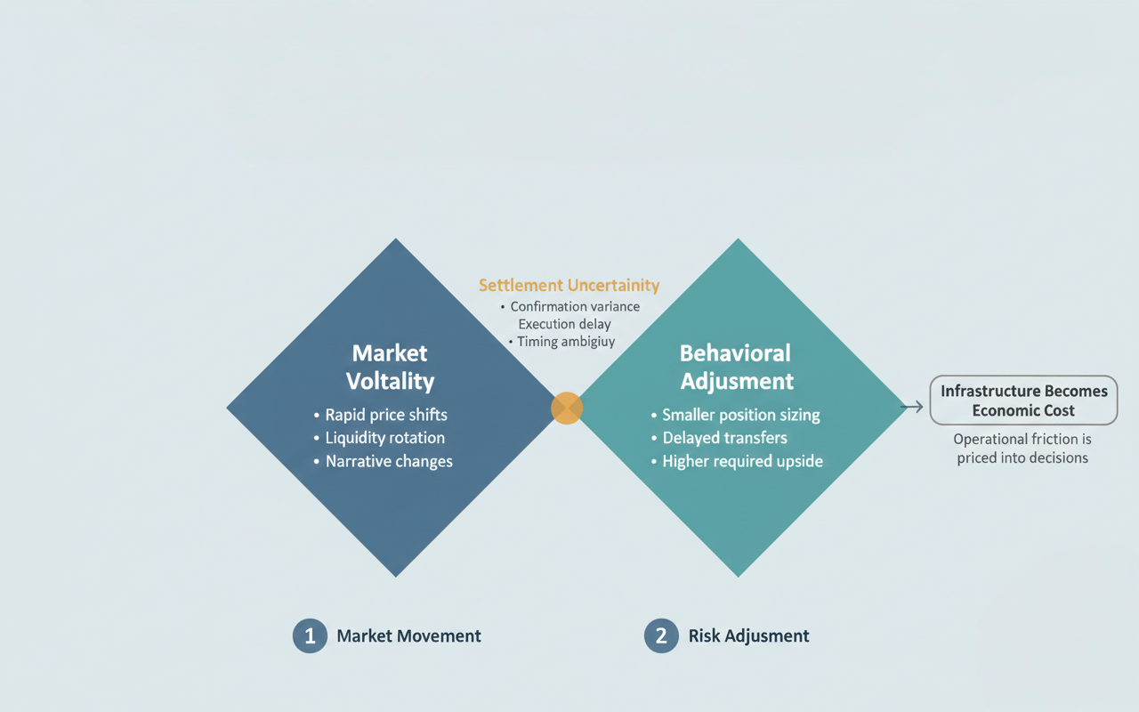 Second, consider settlement timing during volatile market conditions. Markets adjust rapidly, particularly when narratives shift or liquidity rotates between sectors. As soon as users cannot reasonably estimate confirmation speed, they begin to adjust their behavior in subtle but meaningful ways: