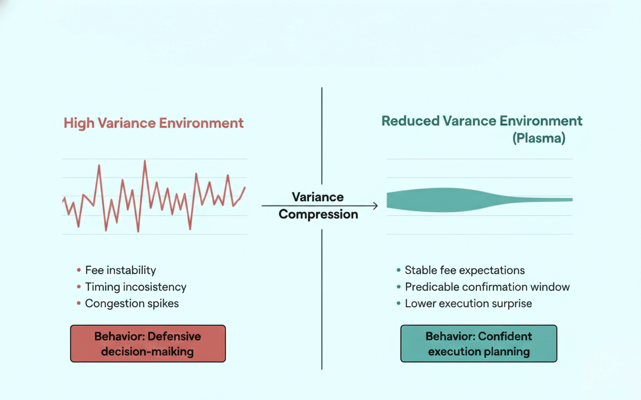 Plasma approaches this challenge from a different and more practical angle. It is not generic scaling rhetoric, nor is it built on dramatic claims about maximum capacity. Instead, it focuses on reducing variance in user experience. Because lower variance translates into fewer negative surprises, users can plan transactions with greater clarity and stronger expectations about outcomes. Furthermore, predictable fees and settlement windows allow participants to make up their mind quickly without constructing defensive buffers for worst-case scenarios that may never materialize.