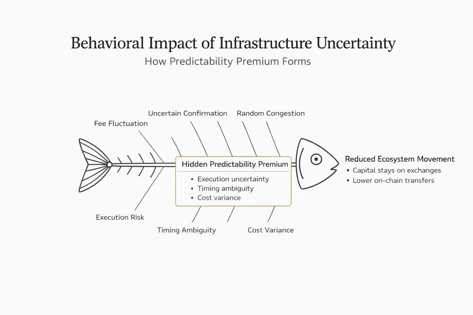 For example, a trader on Binance may identify an opportunity and intend to move funds on-chain in order to capture it efficiently. Yet if network costs are unpredictable or confirmation times feel inconsistent, hesitation naturally appears. Capital remains on exchanges for the time being, activity slows down, and participants choose optionality over execution. Consequently, ecosystem movement weakens. In fact, unpredictability functions like a silent tax on confidence rather than a visible line item in a fee schedule.