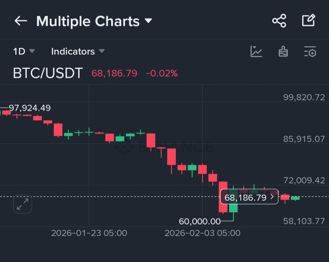 Bitcoin is currently trading around $68,186, showing a slight daily change of -0.02% on the 1D timeframe. The chart reflects a clear short-term downtrend after facing rejection near the $97,900 zone.