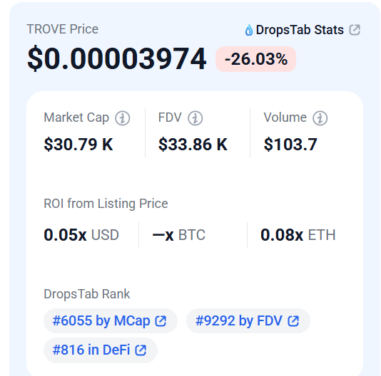 散户们看到 KOL 在群里、推上狂吹“下一个大机会”“Pokemon卡永续”“10倍杠杆”,FOMO 情绪一上来,就冲进去预售买代币 $TROVE,幻想着上所暴富。结果呢?项目方突然说“计划有变”,直接抛弃 Hyperliquid,转头跑去 Solana 生态。代币一上线,价格就像自由落体,直接暴跌99.99999%,从预期两千万美金市值瞬间砸到几万,成交量勉强超过100,流动性稀薄到几乎没法跑。普通散户投资者手里的代币瞬间变成废纸,血本无归,有人投几万刀,最后退回几百刀,哭都哭不出来。