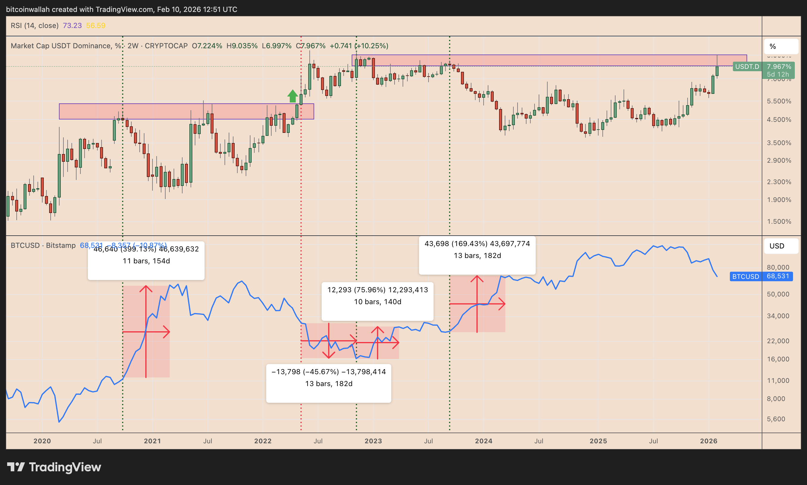 La dominanza di USDT è aumentata al di sopra di quel range a maggio 2022, e Bitcoin è poi sceso del 45%, riflettendo ulteriormente la correlazione inversa tra i due.
