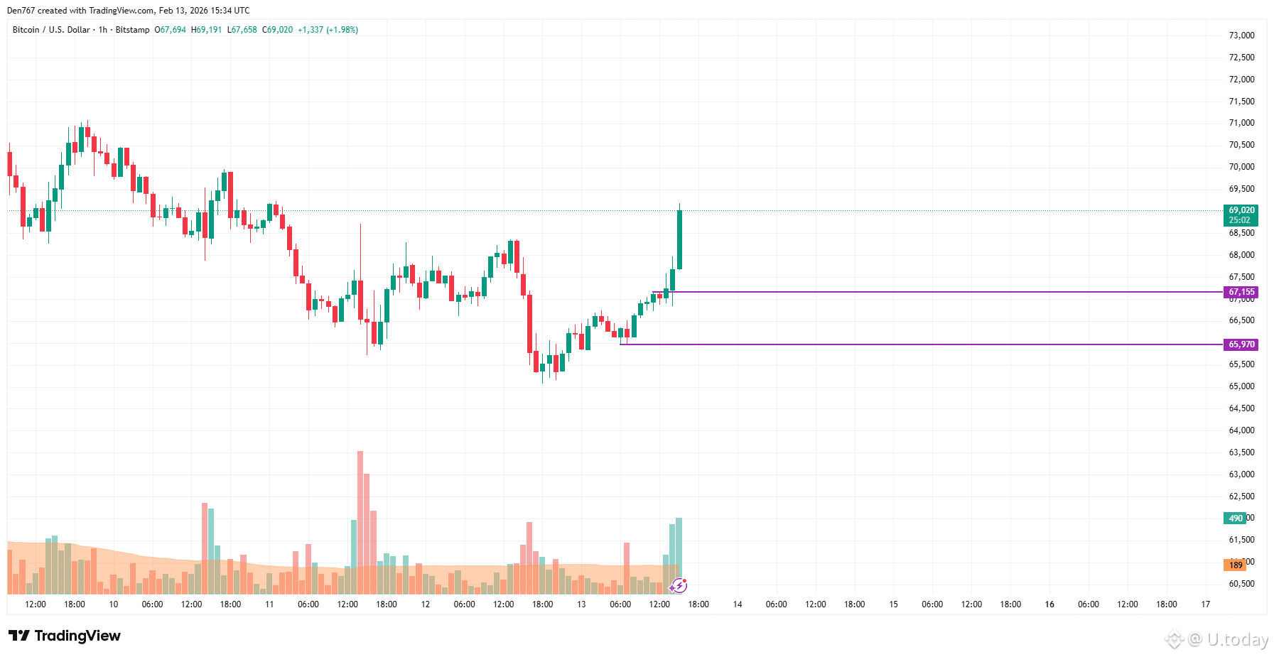 On the hourly chart, the rate of BTC is rising after a breakout of the local resistance at $67,155. If the daily bar closes far from that mark, the upward move may continue to the $70,000 zone.