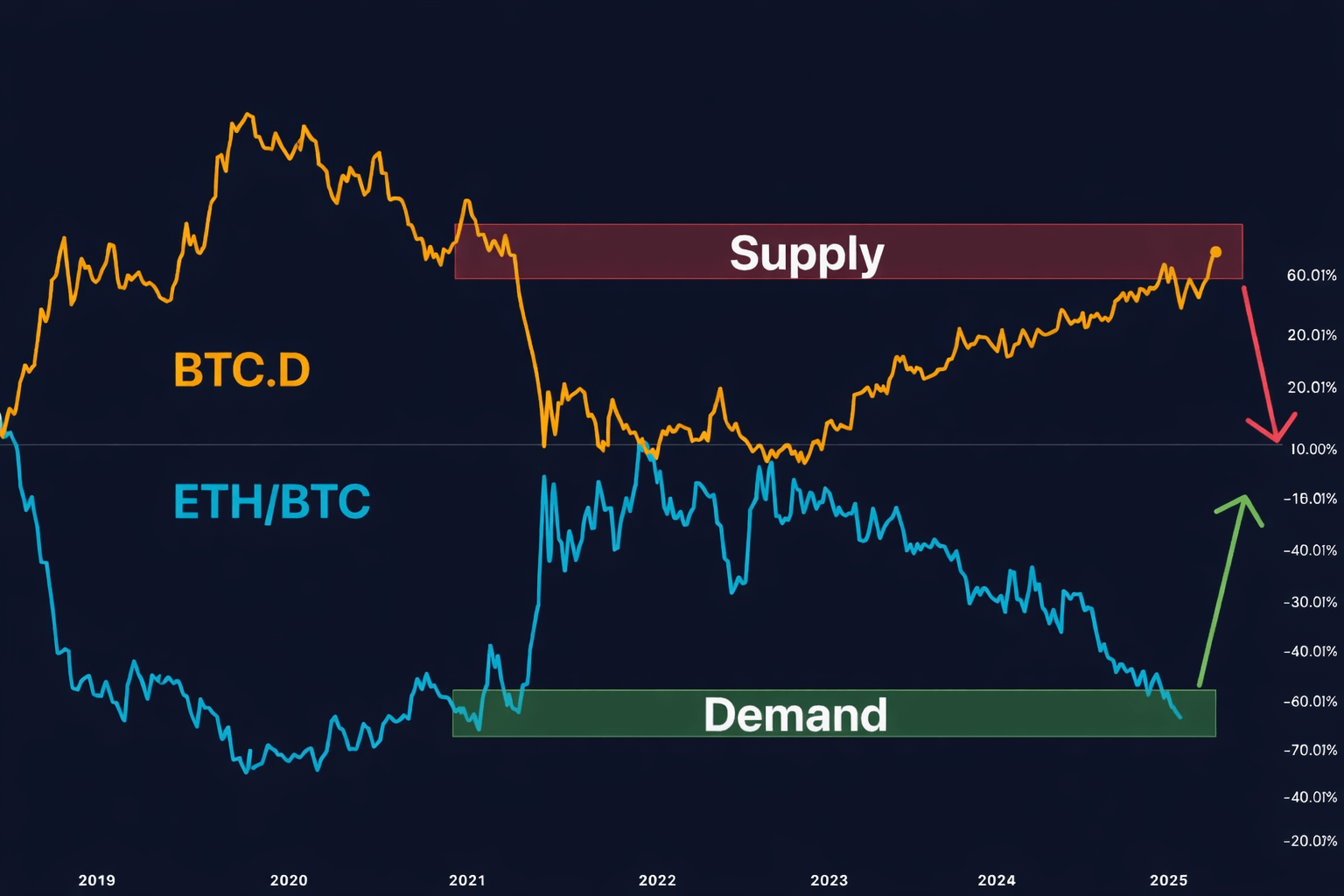 Trong năm 2018 và 2022, khi Bitcoin bước vào giai đoạn suy yếu sau đỉnh, tỷ lệ thống trị của Altcoin cũng giảm dần theo, phản ánh việc dòng tiền rút ra khỏi toàn bộ thị trường chứ không phải luân chuyển nội bộ.