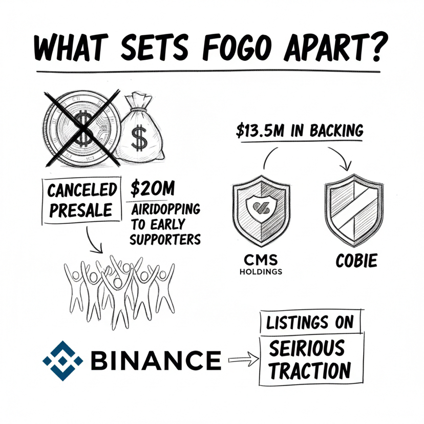 What sets Fogo apart? The team canceled a $20M presale to prioritize community distribution, airdropping tokens to early supporters instead. With $13.5M in backing from CMS Holdings and Cobie, plus listings on Binance , it's gaining serious traction