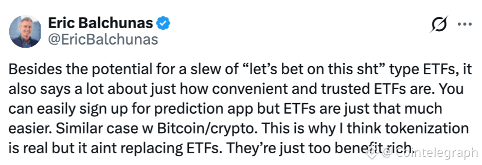 “Opens up huge door to all kinds of stuff,” Balchunas said, adding that prediction market applications are easy to sign up to, but ETFs are “just that much easier.”
