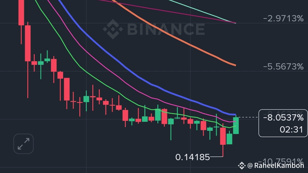 · 🎯 AZIONE PREZZO & PATTTERN: Il prezzo sta cercando di spingere più in alto ma sta affrontando un chiaro rifiuto vicino alla zona di $0.145 - $0.146. Crucialmente, sta lottando per rompere e mantenere sopra le EMA chiave come l'EMA(20) a 0.15021. Questo potrebbe formare un potenziale BULL TRAP o un pattern Double Top nei timeframe inferiori. L'ultima gamba verso l'alto sembra esaurita.