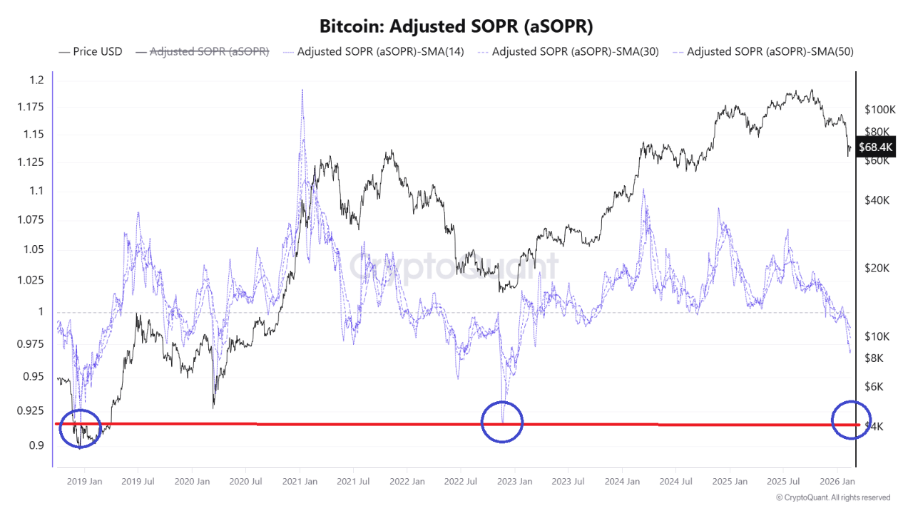 Il SOPR aggiustato di Bitcoin (aSOPR) è tornato verso la zona 0.92–0.94 — un livello che storicamente ha segnato i principali punti di stress del mercato orso.