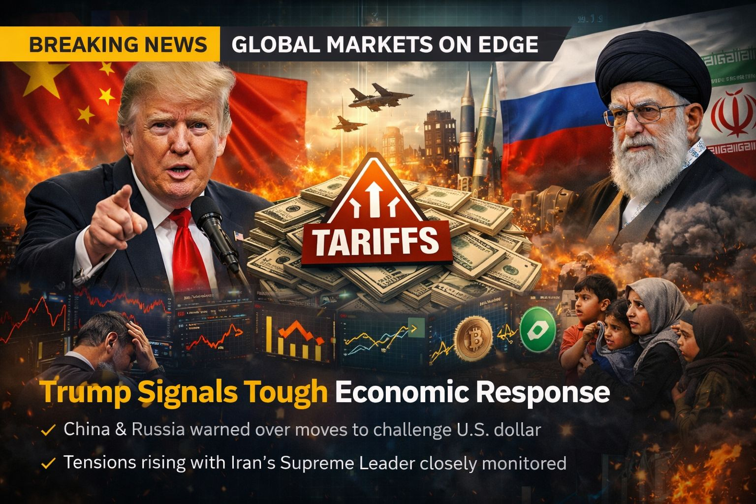 Former U.S. President Donald Trump has issued a strong warning regarding efforts by China and Russia to challenge the dominance of the U.S. dollar. He indicated that any coordinated move against the dollar could trigger extremely aggressive trade measures — including historically high tariffs.At the same time, tensions between the United States and Iran appear to be rising. Trump stated that Washington is closely monitoring developments involving Iran’s Supreme Leader, Ayatollah Ali Khamenei, and suggested that failure to reach a diplomatic agreement could lead to serious consequences.