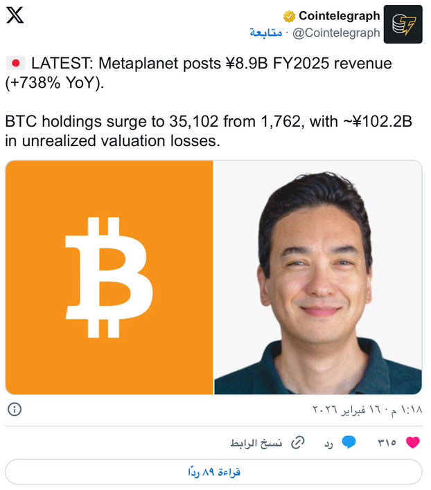 لكن هذا التسارع في التراكم يأتي مع ضغوط واضحة. إذ تواجه الشركة حالياً خسائر تقييم غير محققة بنحو 102.2 مليار ين مرتبطة بتقلبات أسعار بيتكوين في السوق. ويوازن المستثمرون الآن بين نمو إيرادات Metaplanet للسنة المالية 2025 وبين تقلبات الميزانية على المدى القصير.
