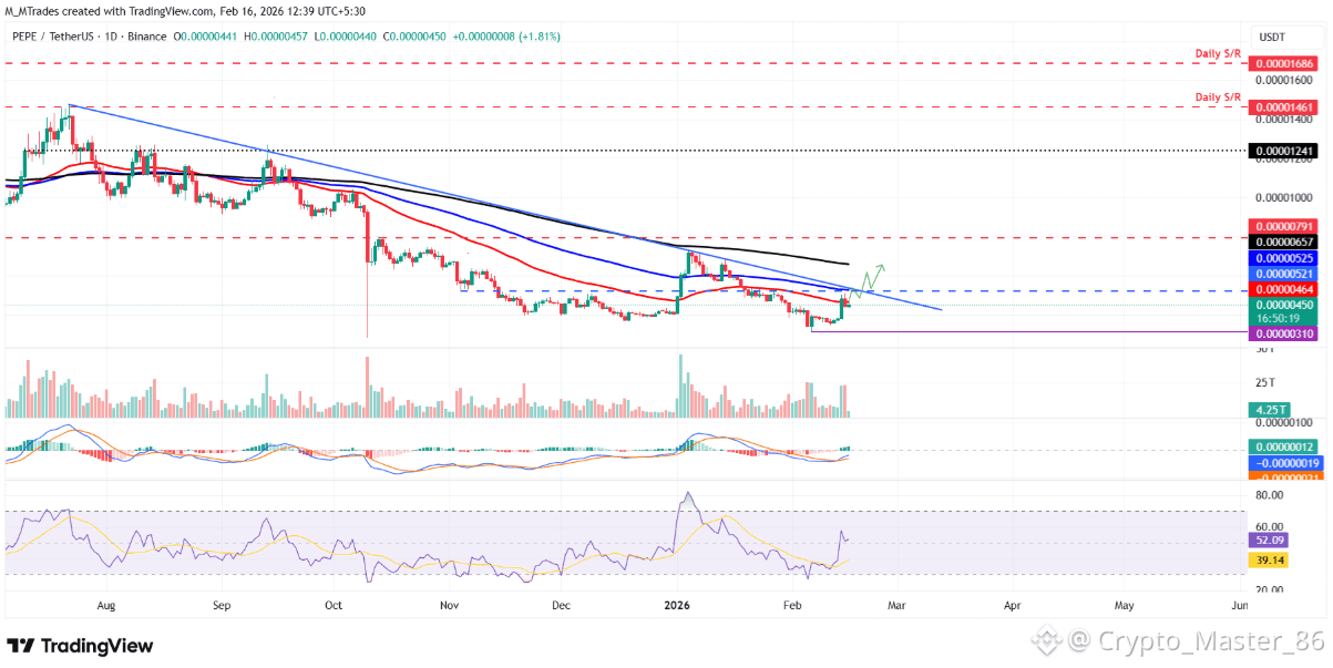 Trong kịch bản tích cực, nếu xu hướng phục hồi được duy trì, PEPE có khả năng mở rộng đà tăng lên vùng kháng cự gần nhất tại $0,0000052, trùng với đường EMA 100 ngày. Việc đóng cửa vững chắc phía trên ngưỡng này có thể tạo tiền đề cho đà tăng tiếp diễn, hướng đến đường EMA 200 ngày tại $0,0000065.