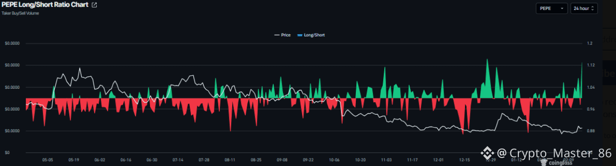 Trên thị trường phái sinh, tỷ lệ long/short của PEPE theo Coinglass đạt 1,13 vào thứ Hai, tiệm cận đỉnh hơn một tháng. Việc chỉ số này duy trì trên mốc 1 phản ánh tâm lý lạc quan, khi phần lớn trader đang nghiêng về kịch bản giá PEPE tiếp tục đi lên.