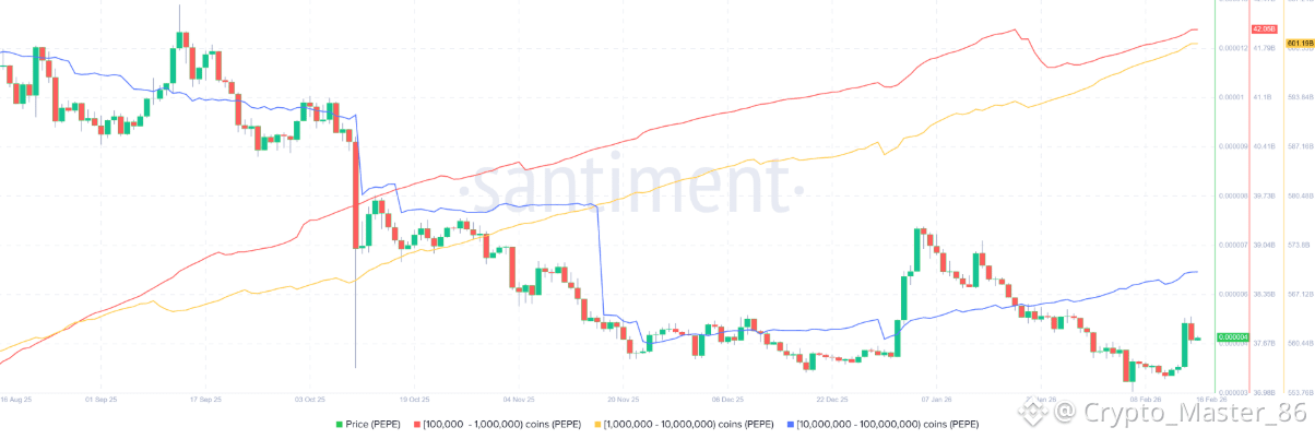 Cụ thể, các ví nắm giữ từ 100.000–1 triệu token (đường đỏ), 1–10 triệu token (đường vàng) và 10–100 triệu token (đường xanh) đã tích lũy tổng cộng 11,82 tỷ PEPE kể từ ngày 11/2. Động thái mua ròng quy mô lớn này cho thấy niềm tin ngày càng rõ rệt của nhóm nhà đầu tư lớn đối với triển vọng của PEPE.