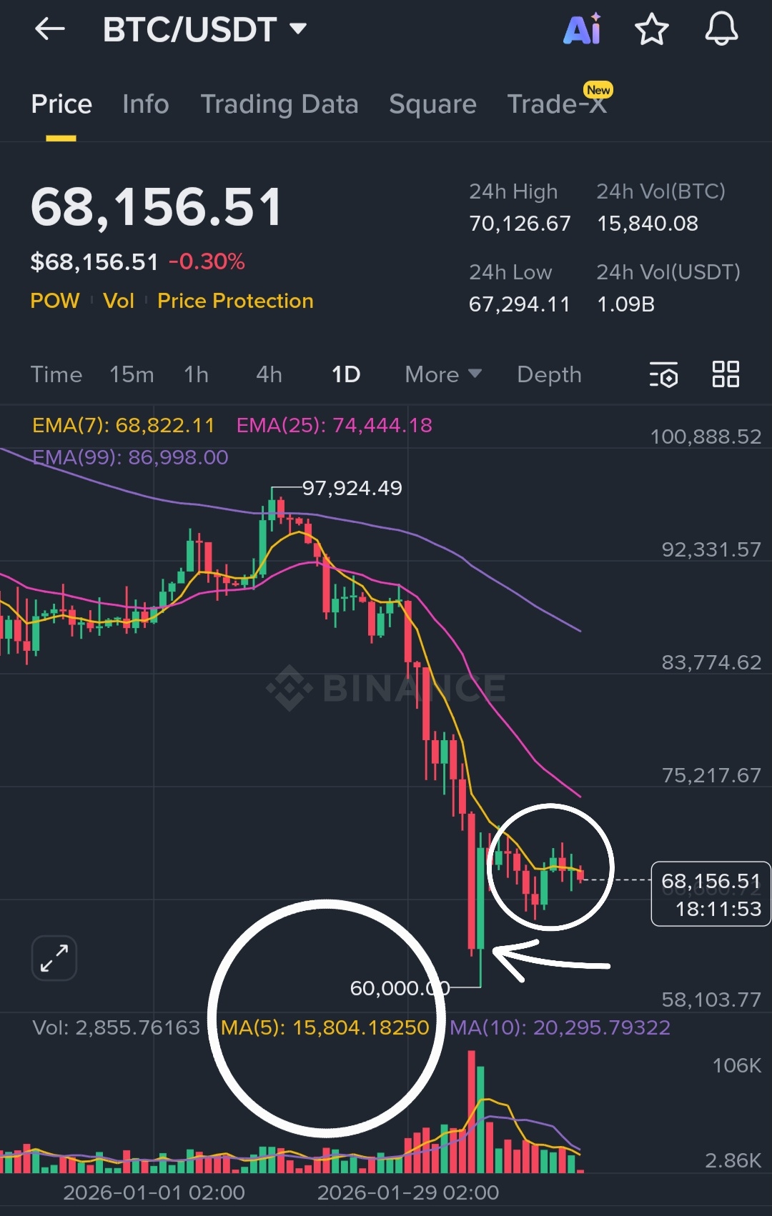 ​أما عند السعر الحالي 68,156 دولار نلاحظ أن أعمدة التداول أقصر بكثير مقارنة بمنطقة القاع. هذا يخبرنا أن الحركة الحالية تفتقر للزخم القوي وهي مجرد تذبذب بانتظار سيولة جديدة. القيمة الموضحة في بيانات الفوليوم عند 15,804 هي معيارك؛ أي عمود يتجاوز هذا الرقم بوضوح يعني أن هناك حركة كبرى قادمة.