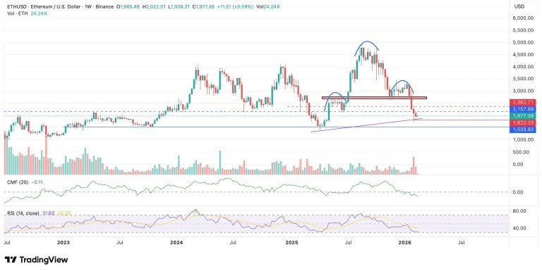 Недельный график ETH с ключевыми уровнями поддержки и фигурами «голова и плечи». Источник: TradingView