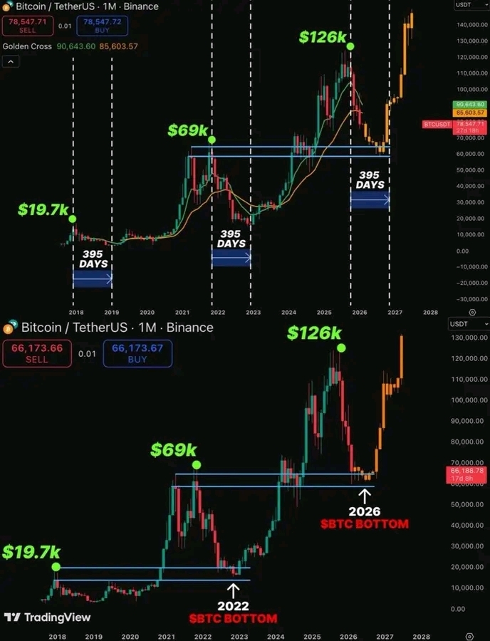 Chart par bottoms ke darmiyan almost same time gap dikhai deta hai. Har badi crash ke baad Bitcoin kaafi arsa sideways move karta hai, phir strong rally start hoti hai.
